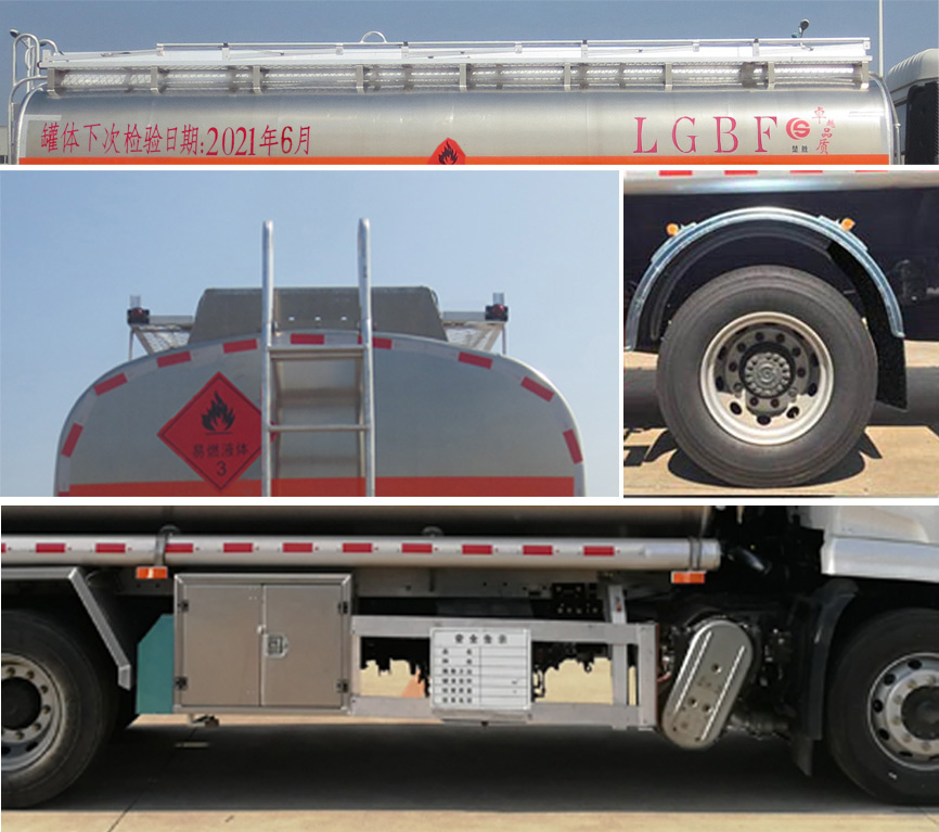 | 配置 | 1、該車適用于危險(xiǎn)品運(yùn)輸,運(yùn)送危險(xiǎn)貨物車輛類型為:FL型,類項(xiàng)號(hào):3。罐體有效容積:16.6立方米,運(yùn)輸介質(zhì):汽油,密度:700千克/立方米,罐體外形尺寸(長×寬×高)(mm):5700×2300×1600。2、側(cè)/后防護(hù)材料為鋁合金,螺栓連接。后防護(hù)截面尺寸120×60mm,下邊緣離地高500mm。罐體上部選裝上走道,選裝弧形擋泥板,選裝右側(cè)防護(hù)樣式。3、僅采用軸距(mm):4700。后軸采用空氣懸架。隨底盤選裝駕駛室前面罩,選裝側(cè)窗玻璃;駕駛室頂部中間三個(gè)裝飾燈為選裝件;前霧燈為選裝件;駕駛室前臉擾流罩為選裝件。僅選用排氣管前置、限速裝置(限速80km/h)、前輪盤式制動(dòng)及子午線輪胎的底盤;安裝帶有衛(wèi)星定位功能的行駛記錄儀;ABS型號(hào)/生產(chǎn)廠家:3631010-C2000/東科克諾爾商用車制動(dòng)系統(tǒng)(十堰)有限公司。采用的發(fā)動(dòng)機(jī)與油耗值(L/100Km)對應(yīng)關(guān)系為: B6.2NS6B210/26.5,DDi50E190-60/23.9。 該車后軸為采用空氣懸架.轉(zhuǎn)向輪安裝輪胎爆胎應(yīng)急防護(hù)裝置。該車型可選裝ETC車載裝置. | ||