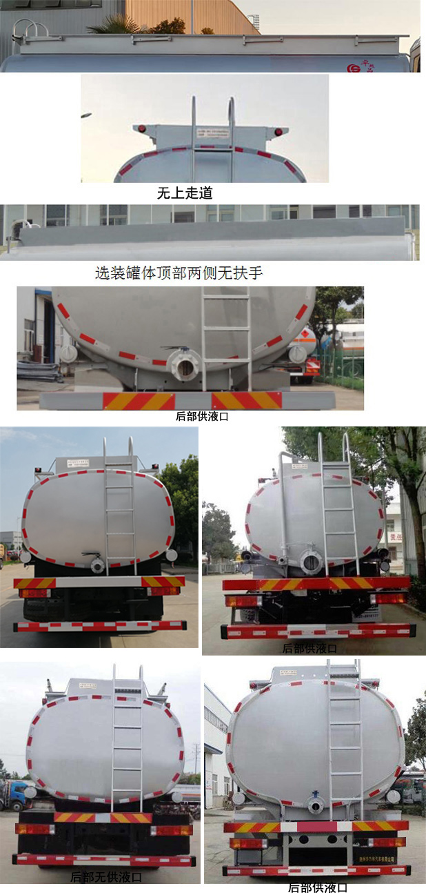 備注隨底盤選裝同系列駕駛室,選裝進氣口樣式。選裝罐體上部無上走道,有扶手或無扶手,后示廓燈架樣式;選裝罐體后部供液口閥門。