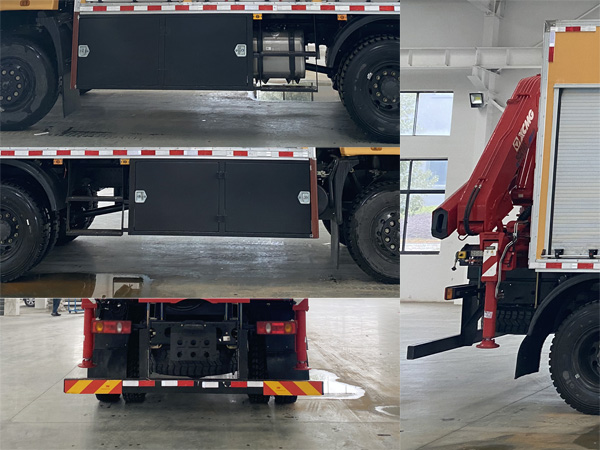 其它:1、該車主要用于搶險救災、賽事活動等的應急照明支援;主要專用裝置:照明系統,發電機組,吊機等;廂體頂部密閉,不可開啟。2、側防護為裙邊結構,材料Q235;后防護材料采用Q235,螺栓連接,截面尺寸125×60mm,下邊緣離地高485mm。3、ABS型號/生產廠家:3631010-C2000/東科克諾爾商用車制動系統(十堰)有限公司。