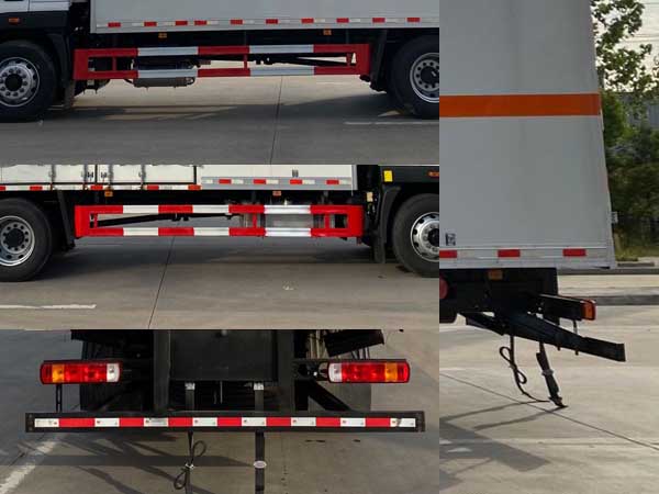 其它 | ABS型號:ABS-E,ABS/ASR-24V-4S/4M,CM4XL-4S/4M,3550D-1010;ABS生產企業:威伯科汽車控制系統(中國)有限公司,東科克諾爾商用車制動系統(十堰)有限公司,廣州瑞立科密汽車電子股份有限公司,東科克諾爾商用車制動系統(十堰)有限公司;安裝有限速裝置;限速裝置限速(km/h):80;安裝有具有衛星定位功能的行駛記錄儀;選裝描述:選裝側門型式及位置,選裝側門數量,選裝不開側門,廂體側面板選裝開百葉窗,選裝瓦楞板結構.該車型可選裝ETC車載裝置;發動機/油耗值(L/100km)對應關系為:F4.5NS6B220/24.4,B6.2NS6B210/26;側后防護情況:側、后防護材料均為Q235,螺栓連接,后防護截面尺寸120×70mm,下邊緣離地高450mm;車廂頂部封閉且不可開啟;運輸獨立容器(瓶)包裝的貨物;危險貨物類項號:第3類;其他說明:僅選用排氣管前置、前輪盤式制動及子午線輪胎的底盤.該車轉向輪安裝輪胎爆胎應急防護裝置,后軸采用空氣懸架.該車為危險貨物運輸車。選裝后尾板時,后防護材料為Q235,焊接,截面尺寸120×50mm,下邊緣離地高450mm。尾板收起狀態水平長度為290mm,尾板質量為550kg。隨底盤選裝駕駛室;選裝燃油箱,電瓶,尿素罐,后處理,儲氣筒左右安裝位置。 | ||