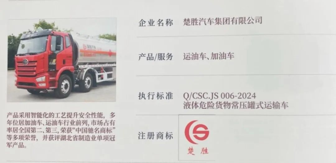 2025年4月9日,湖北省“湖北精品”認定榜單正式發布!楚勝汽車集團自主研發的加油車、運油車系列產品,歷經技術先進性、質量穩定性、市場認可度、品牌影響力四重嚴苛考核,從全省制造業優品中脫穎而出,成功獲此省級質量標桿認證!這一榮譽不僅彰顯了楚勝在專用車領域的技術制高點地位,更以權威背書印證了“中國質造”的硬核實力!