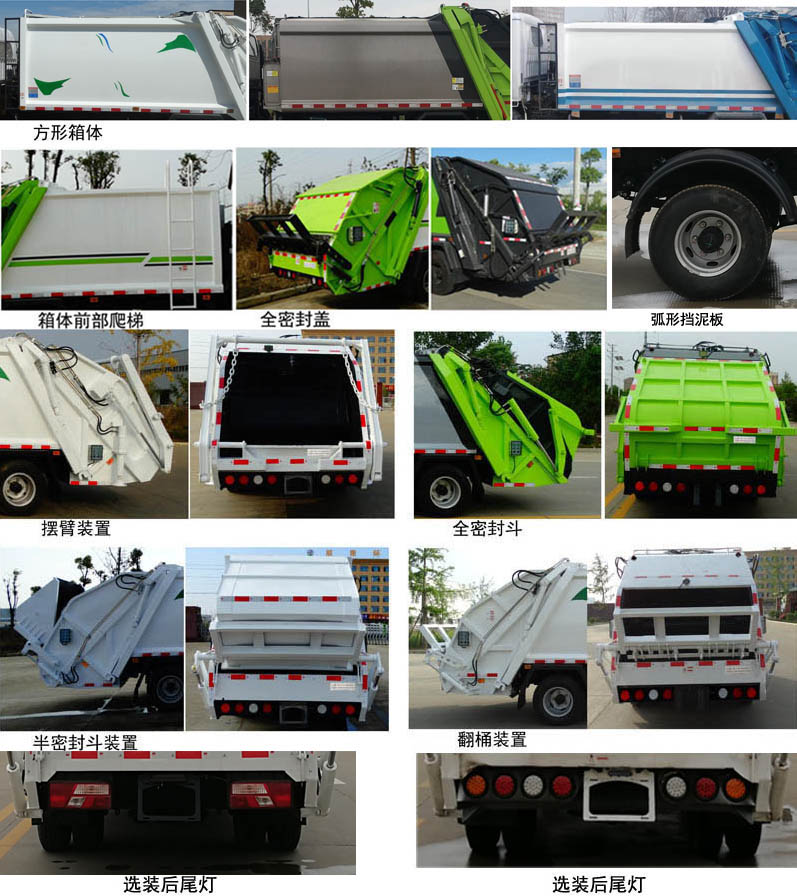 | 配置 | 1、該車主要專用裝置由箱體、壓縮系統組成,用于垃圾的收集與清運。該車可選裝方形或弧形箱體,選裝全密封蓋裝置,選裝弧形擋泥板,選裝箱體前部爬梯,選裝后部工作裝置。選裝工作裝置時,外形長(mm)/后伸(mm)/整備質量(kg)對應關系:①無上料裝置: 6570/-/5830;②擺臂裝置: 6730/160/6100;③全密封斗裝置: 6770/200/6100;④翻桶裝置,半密封斗裝置:6970/400/6100。2、側防護采用冷彎型鋼/Q235,螺栓連接;后防護由專用裝置替代,下邊緣離地高500mm。3、隨底盤選裝黑色輪輞。ABS系統型號: VIE ABS-II,ABS系統生產廠家: 浙江萬安科技股份有限公司。發動機JX4D306H的油耗值為14.5L/100km。 | ||