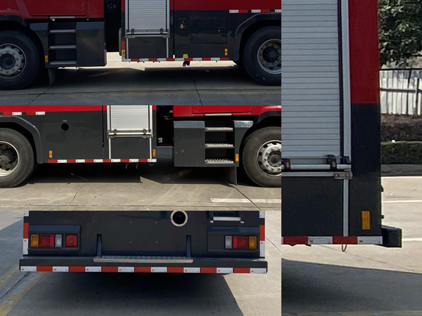 其它:罐體總容積為6.600立方米,水罐尺寸:2390×2400×1200mm。整體式側防護結構,后防護裝置材料:Q235A,截面尺寸:100×120mm,與車輛連接方式:螺栓連接,后防護離地高度:398mm,ABS生產企業為浙江亞太機電股份有限公司,型號為APG3550500H1。主要專用裝置有消防泵、消防炮。